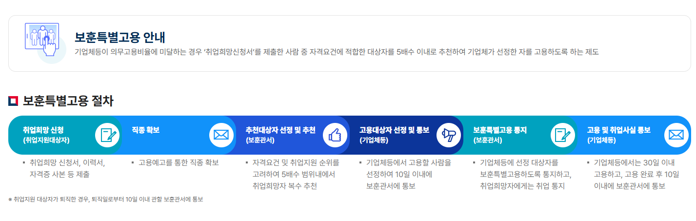 - 보훈특별고용: 취업지원 실시기관(일정 규모 이상 기업 등)의 의무고용 비율에 따라 보훈(지)청의 추천을 통해 채용