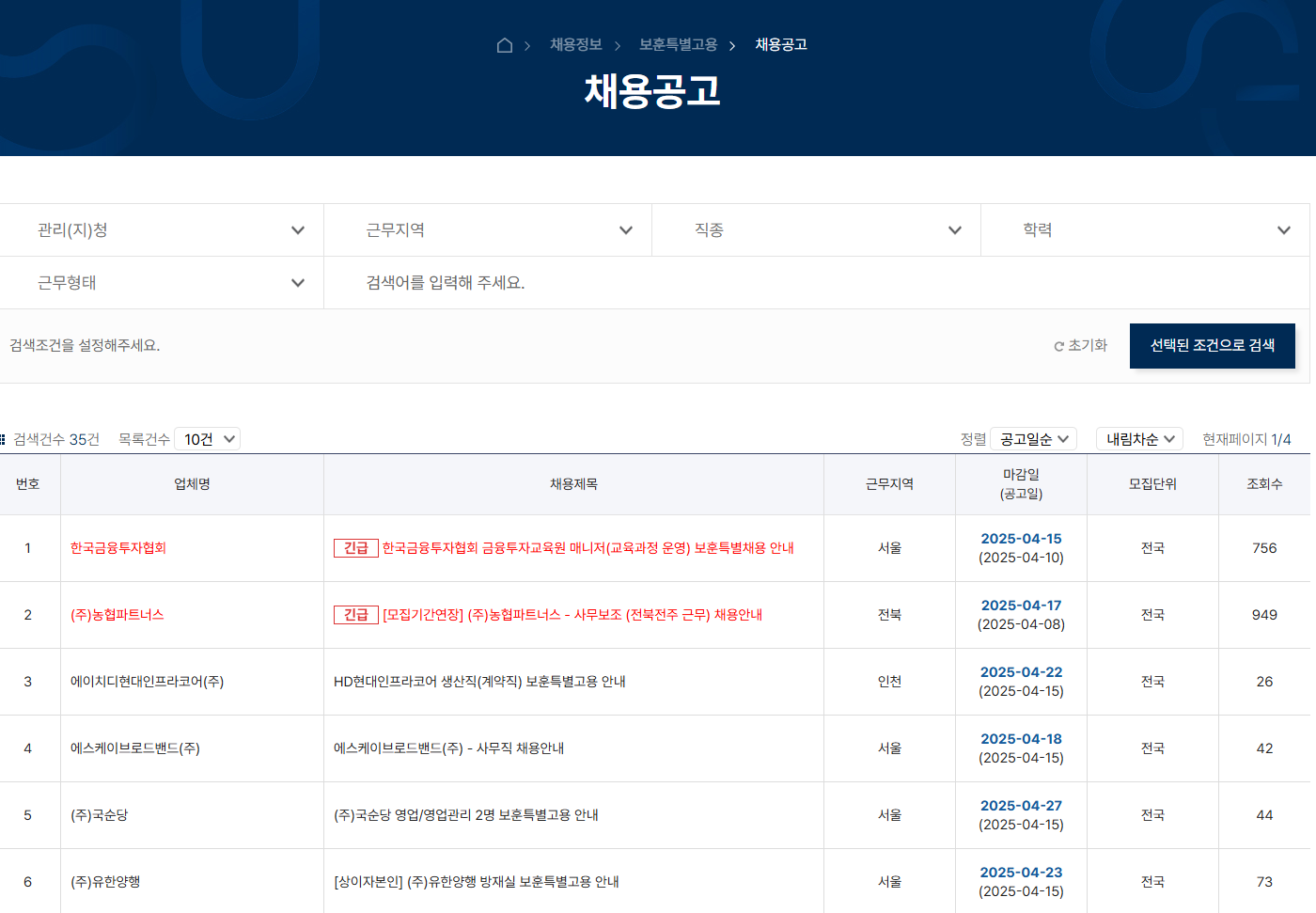 - '보훈특별고용', '추천채용' 등 보훈대상자에게 특화된 채용 공고를 별도로 확인할 수 있습니다.