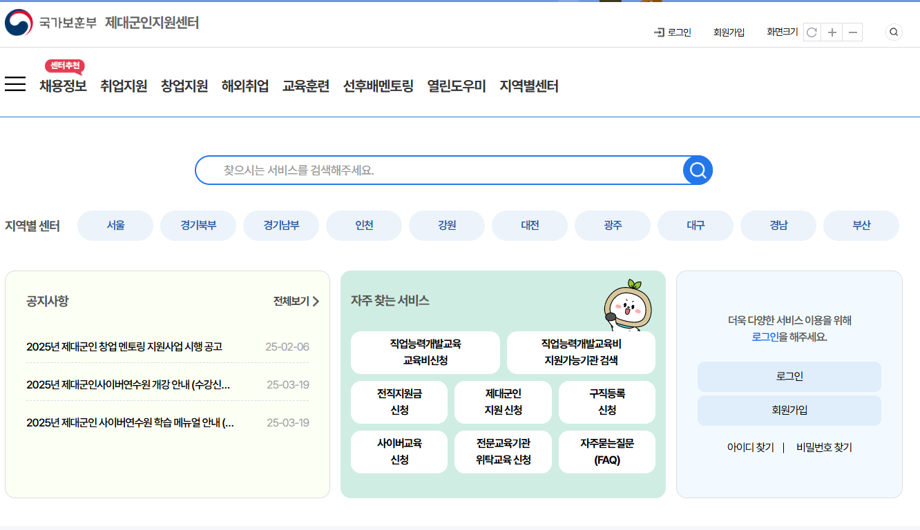 - 주요 서비스: 1:1 진로상담, 취/창업 역량 강화 교육, 교육비 지원, 기업체 채용 협력 등 제대군인의 성공적인 사회 정착을 위한 맞춤형 프로그램 제공