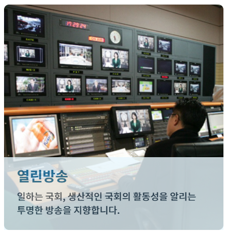국회방송은 국민의 알 권리를 충족시키기 위한 공공방송으로 국회의 활동과 정책현안, 입법 정보 등에 대한 폭넓은 정보를 공정하게 제공합니다. 국회방송에서는 본회의, 위원회, 청문회 등 주요회의를 편집 및 가감없이 생중계하는 것을 기본으로 합니다. 그 외 각종 보도 · 시사 프로그램과 입법정보 프로그램, 문화 · 교양 프로그램 등이 24시간 방송되고 있습니다.