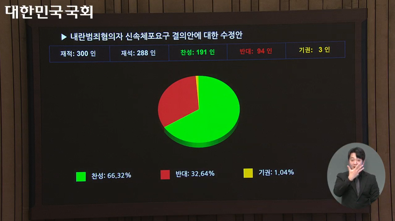 2024년 12월 10일, 제 418회 국회(정기회) 제 18차 본회의에서 윤석열 대통령을 포함한 8명의 내란 범죄 혐의자에 대한 신속 체포 결의안이 국회에서 재석 288인 중 찬성 191인, 반대 94인, 기권 3인으로서 가결되었으며, 헌정 질서를 지키기 위한 조치가 강조되었습니다.