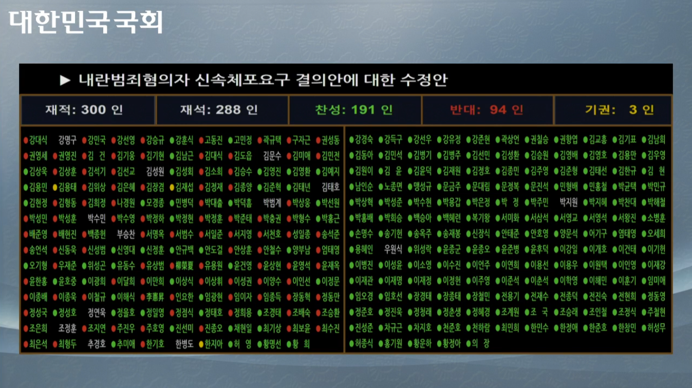 2024년 12월 10일, 제 418회 국회(정기회) 제 18차 본회의에서 윤석열 대통령을 포함한 8명의 내란 범죄 혐의자에 대한 신속 체포 결의안이 국회에서 재석 288인 중 찬성 191인, 반대 94인, 기권 3인으로서 가결되었으며, 헌정 질서를 지키기 위한 조치가 강조되었습니다.