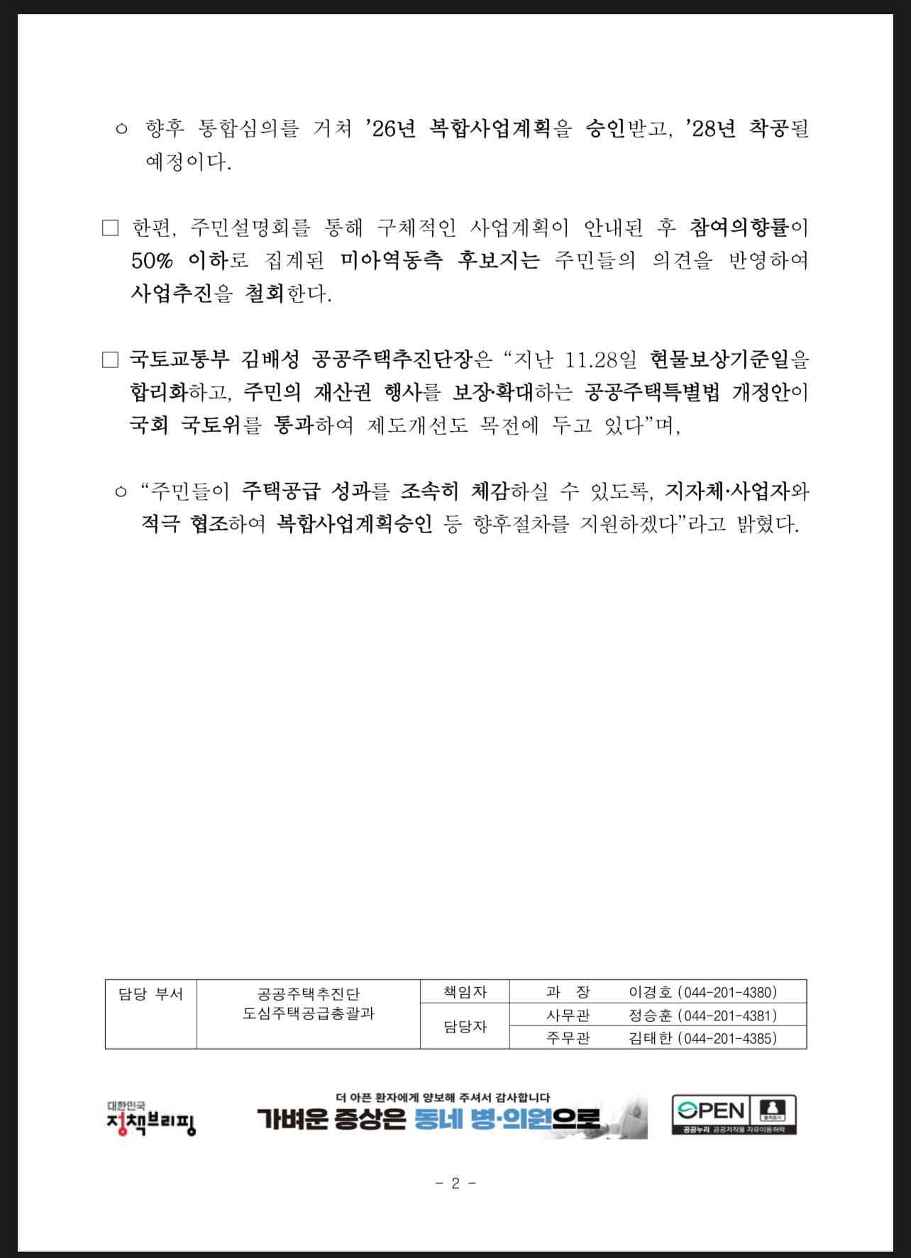 최근 11월 28일에는 현물보상기준일 합리화와 주민의 재산권 행사를 보장·확대하는 공공주택특별법 개정안이 국회 국토위를 통과하여, 사업 진행의 법적 기반이 더욱 견고해졌습니다. 이를 통해 주민들의 권익 보호와 원활한 사업 진행이 기대됩니다.