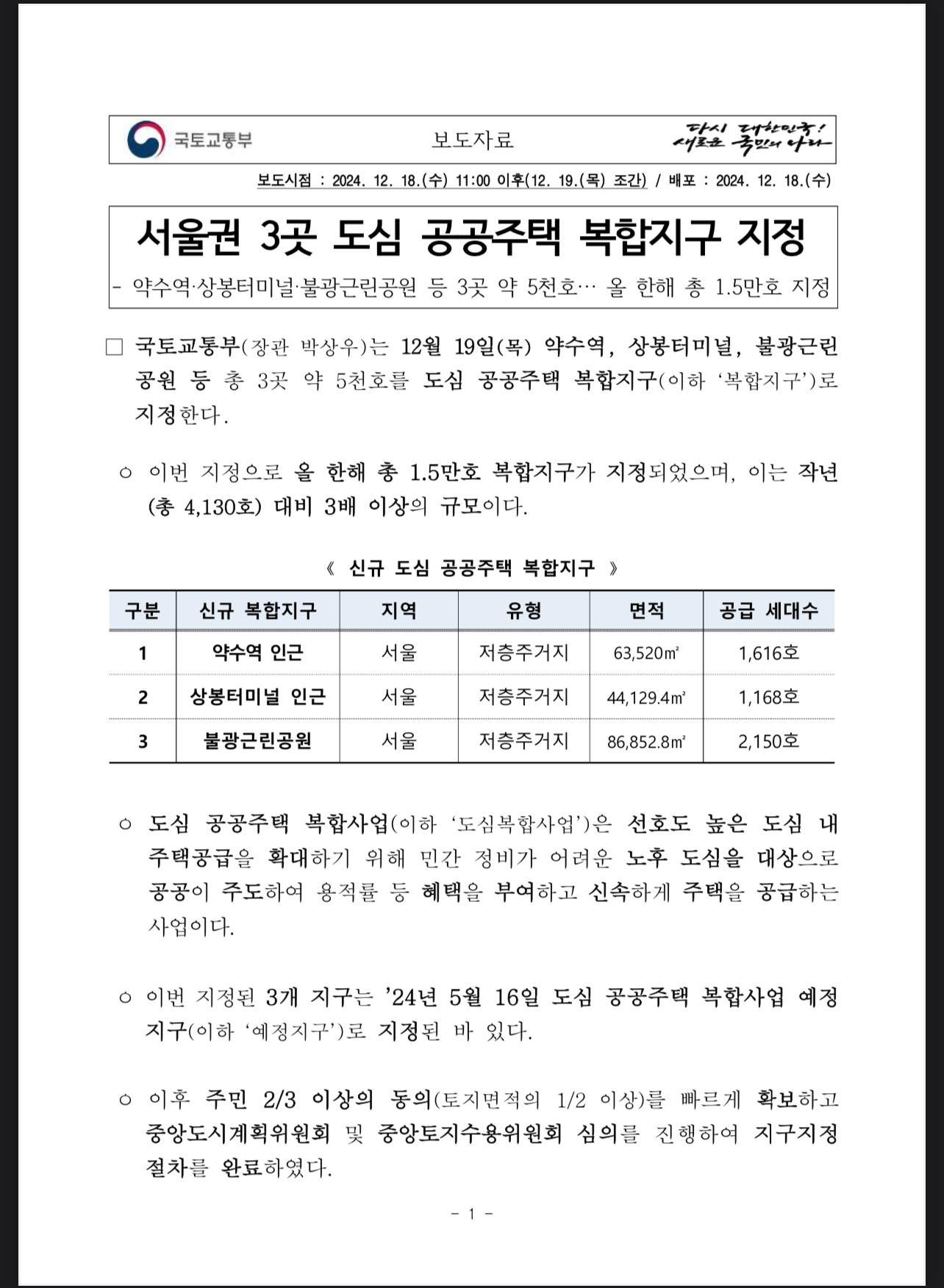 이번 서울 3곳의 도심 공공주택 복합지구 지정은 서울의 주택 공급 부족 문제를 해결하고, 도심 주택 공급 확대와 주거 환경 개선에 중요한 발걸음입니다. 도심 공공주택 복합지구 지정은 서울 시민들의 주거 안정성을 높이고, 도심 내 양질의 주거공간을 확보하는 중요한 발걸음이 될 것으로 기대됩니다. 국토교통부는 앞으로도 지자체 및 사업자와 긴밀히 협력하여 원활한 사업 진행을 지원할 예정이며, 이를 통해 시민들이 실질적인 주택공급 성과를 체감할 수 있도록 노력할 것입니다.