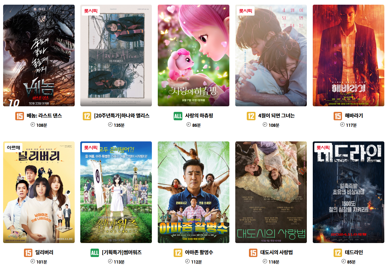 - 각 영화의 예매는 롯데시네마 공식 웹사이트에서 가능합니다.