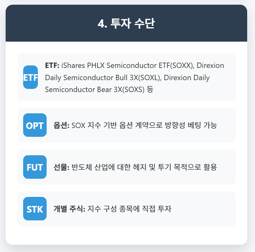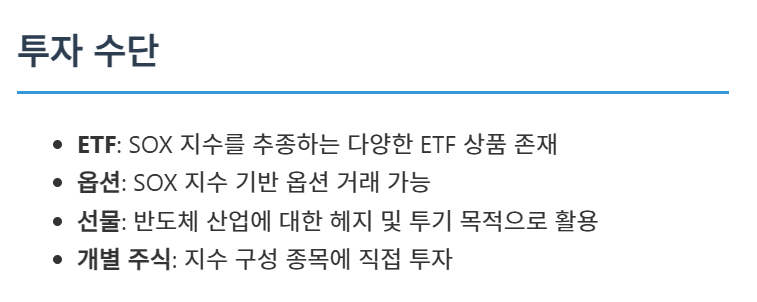 이 지수에 투자하고 싶은 투자자들은 SOXX와 같은 ETF를 통해 간접적으로 투자할 수 있습니다. 이러한 ETF들은 필라델피아 반도체 지수를 추종하며, 반도체 산업 전반에 분산 투자하는 효과를 얻을 수 있습니다.
