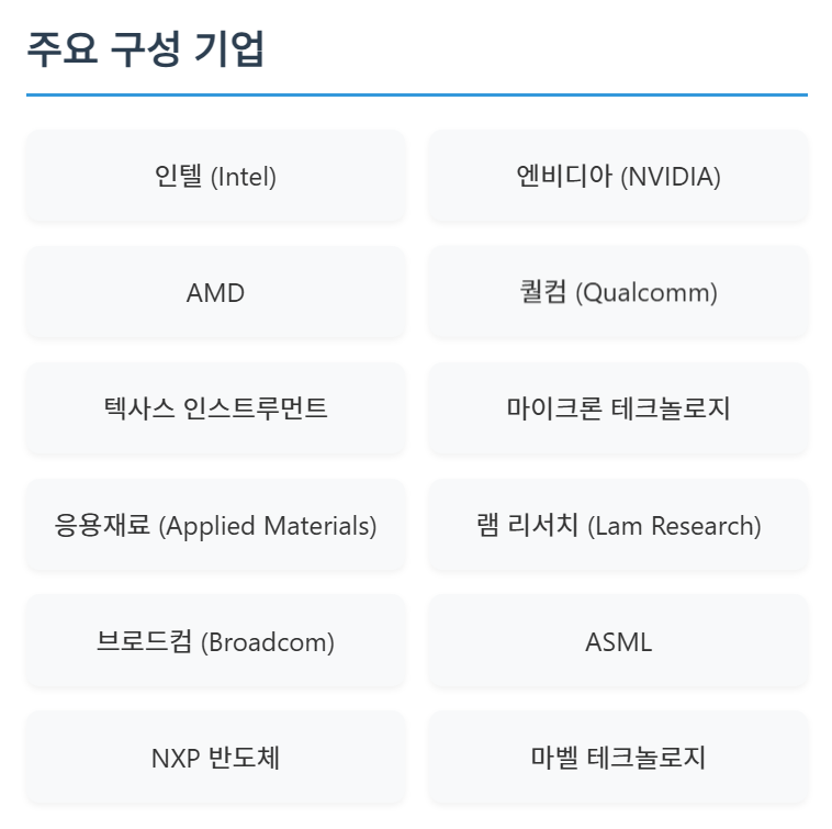- 구성: 약 30개의 미국 반도체 관련 기업들로 구성됩니다.