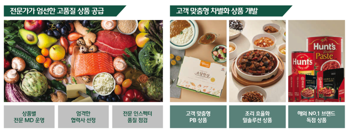 전문가가 엄선한 고품질 상품 공급, 고객 맞춤형 차별화 상품 개발, 업계 최대 규모 전국 유통망, 대규모 광역 물류센터(이천, 수원, 동탄, 양산, 장성), 프레시원, CJ대한통운 등 전국 유통망을 통해 고객이 원하는 식자재를 맞춤 공급합니다.