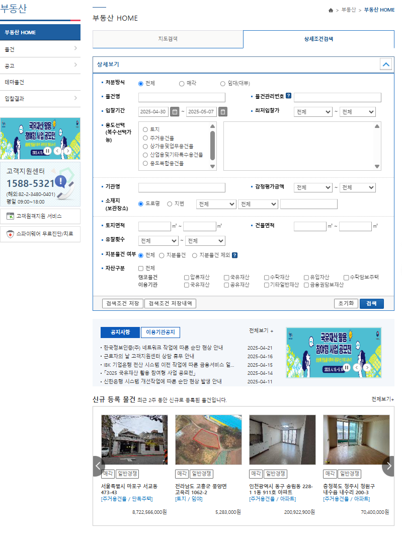 - 상세조건 검색: '부동산' 또는 '동산/기타자산' 메뉴의 '물건찾기'에서 용도, 소재지, 처분기관(예: OO세무서, OO시청), 가격 범위, 입찰 기간 등 상세 조건을 설정하여 정밀하게 검색할 수 있습니다.