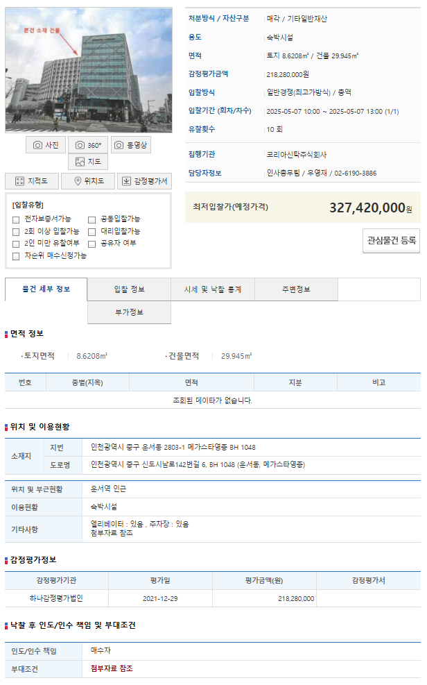 - 물건 세부정보: 소재지, 면적, 용도, 구조 등 상세 스펙