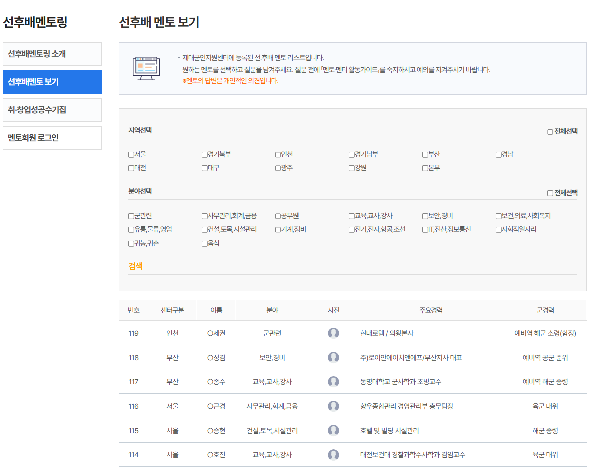 - 창업을 희망하는 제대군인을 위해 단계별 창업 교육, 전문가 멘토링, 창업 정보 등을 제공합니다.