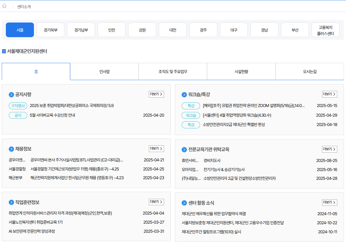 - 센터소개: 전국 제대군인지원센터 위치 및 연락처를 확인할 수 있습니다.