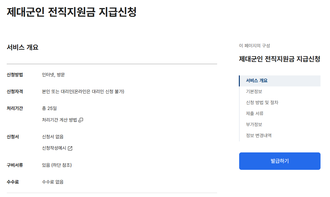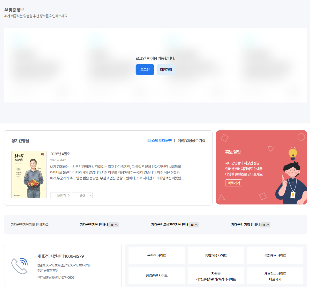 - 회원가입/로그인: 서비스 신청 및 이용을 위해 제대군인 정보 등록 및 로그인이 필요합니다.