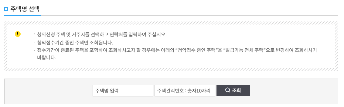 주택명 입력하거나 주택관리번호 숫자 10자리를 입력 후 조회합니다.