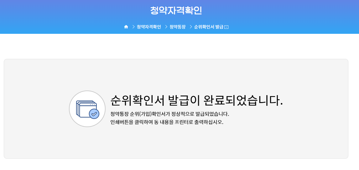 - 청약통장 순위(가입)확인서의 발급내역은 발급일로부터 30일 간 한국부동산원 청약홈에서 조회할 수 있습니다.