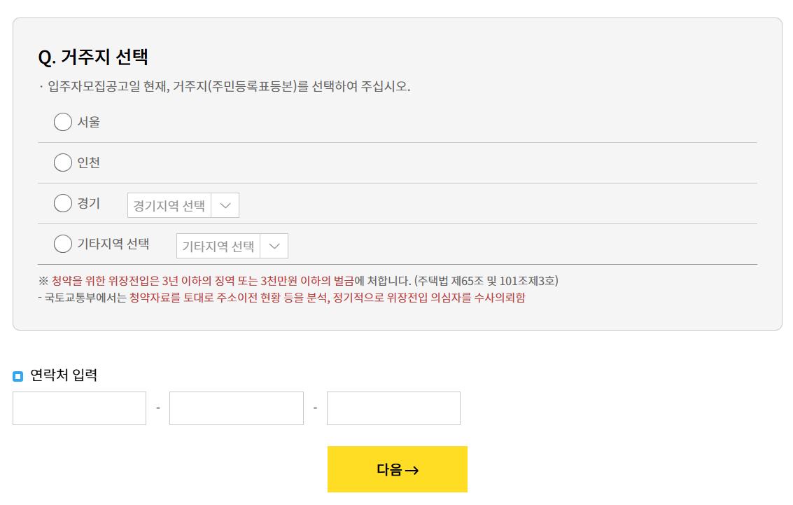 ※ 청약을 위한 위장전입은 3년 이하의 징역 또는 3천만원 이하의 벌금에 처합니다. (주택법 제65조 및 101조제3호)