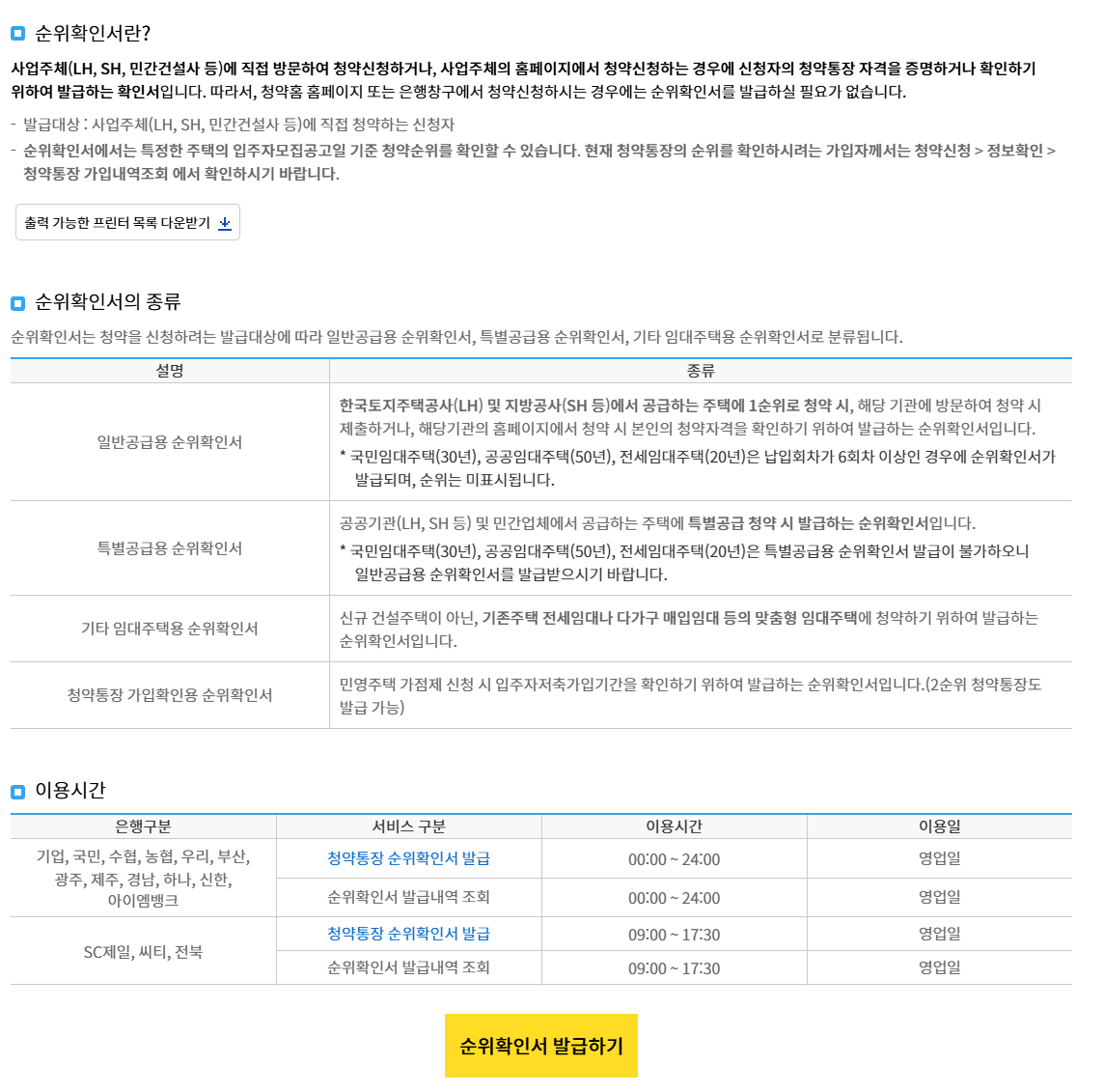 | SC제일, 씨티, 전북 | 청약통장 순위확인서 발급 | 09:00 ~ 17:30 | 영업일 |