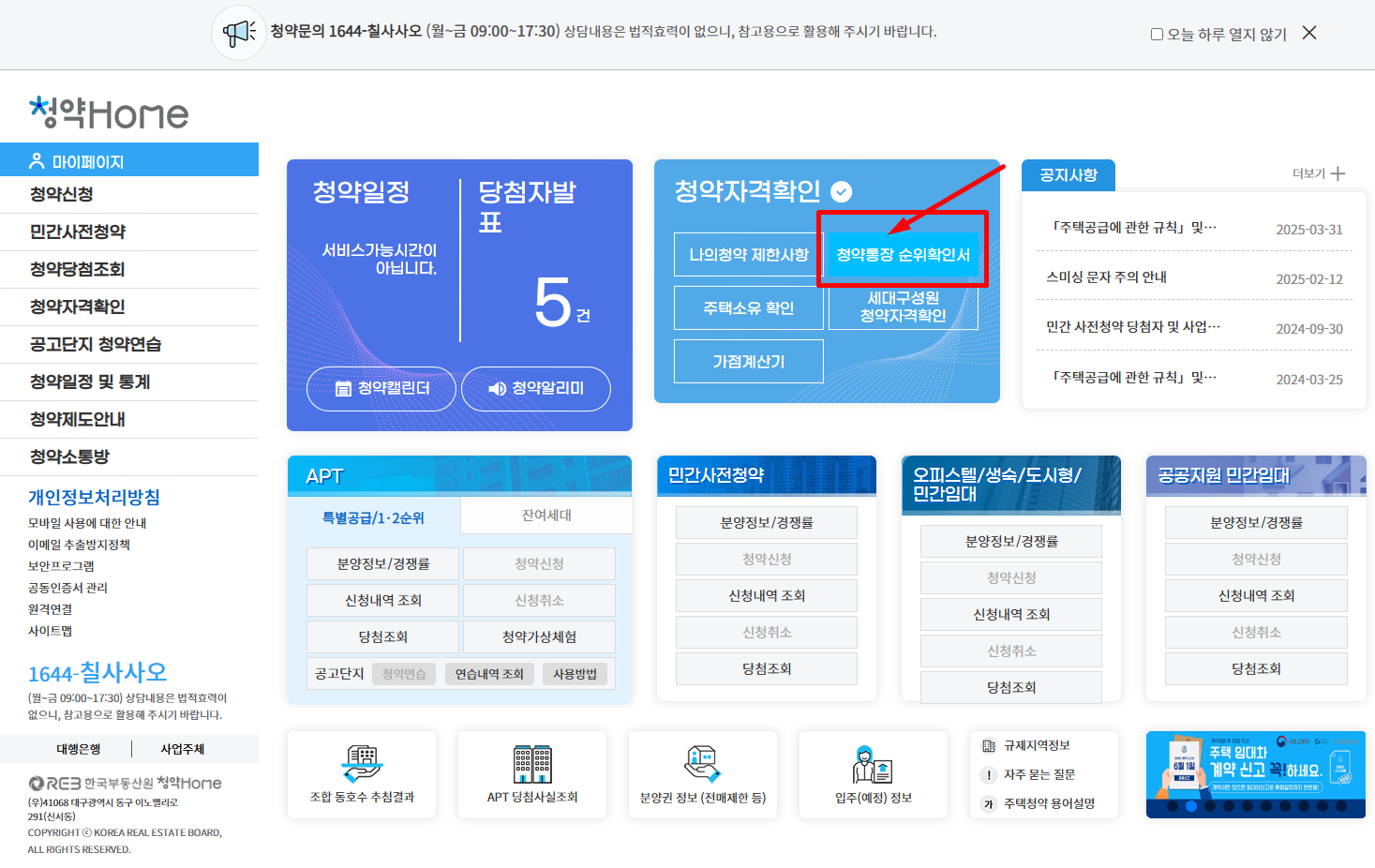 - 청약통장 순위(가입) 내역은 청약신청 주택의 입주자모집공고일 기준입니다.