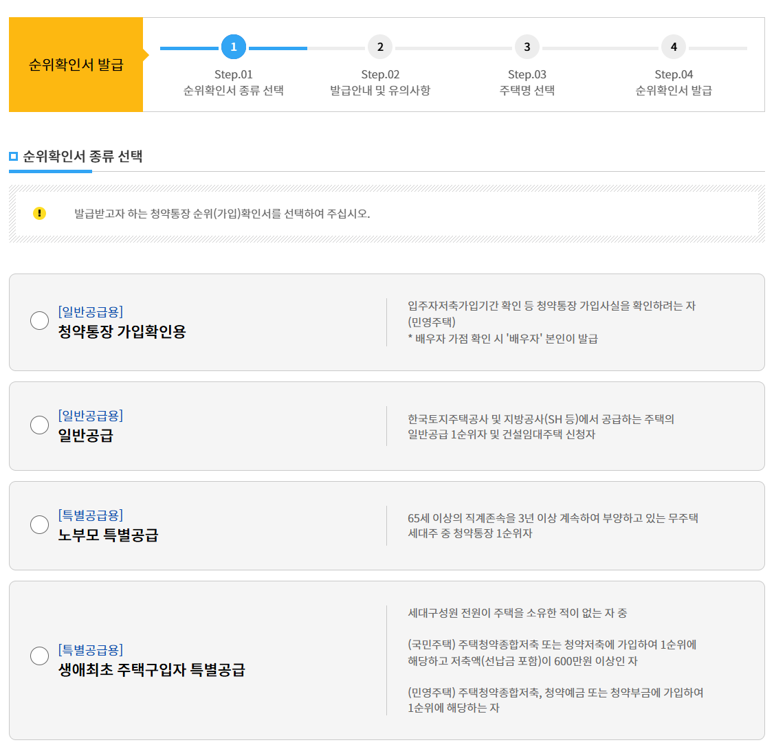 발급받고자 하는 청약통장 순위(가입)확인서를 선택하여 주십시오.
