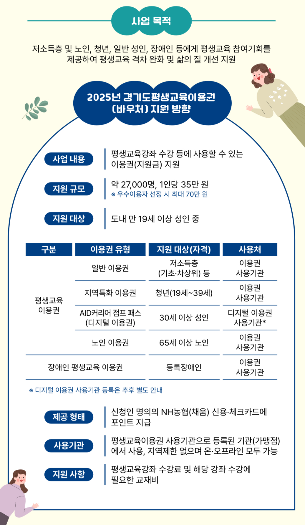 평생교육이용권은 평생교육이용권 사용기관의 강좌 수강료 및 해당 강좌의 교재를 구입할 수 있는 이용권(지원금)을 지급합니다.