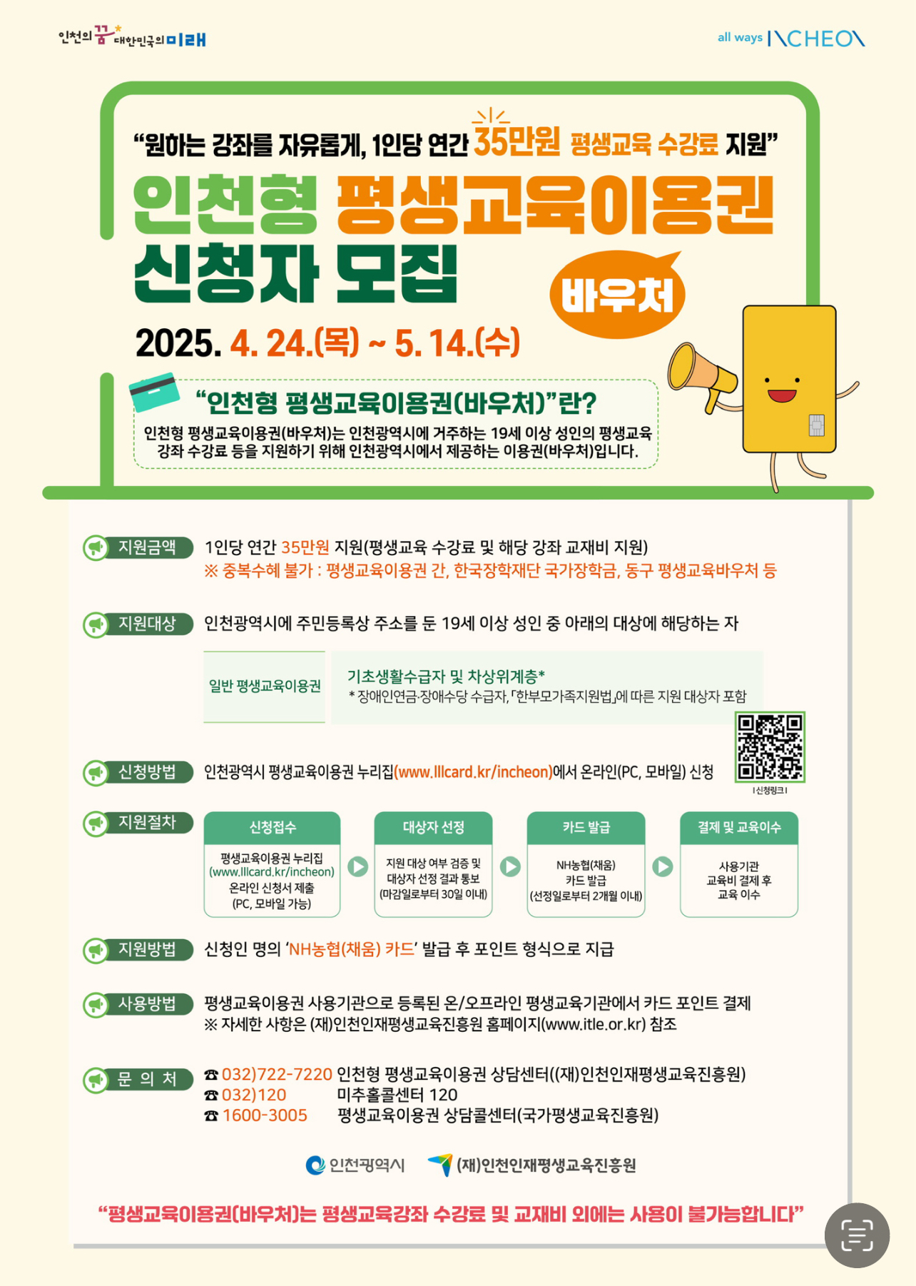 평생교육이용권은 이용권 선정자 본인 명의의 NH농협채움카드(신용·체크)에 포인트 형태로 지원금이 충전됩니다. 따라서, 본인 명의의 NH농협채움카드를 발급받아 사용이 가능합니다.