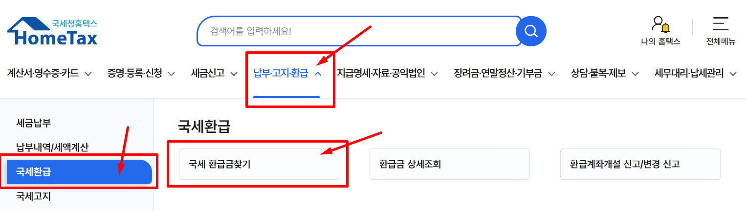1. 납부 고지 환급 → 국세환급 → 국세 환급금찾기 선택합니다.